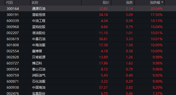 主要行业板块和赛道方面,若按照申万一级行业划分,石油石化板块领涨,板块盘中涨幅超过6%,通源石油(300164)盘中“20cm”涨停,中油工程(600339)、蓝焰控股(000968)、中曼石油(603619)、准油股份、中海油服(601808)、惠博普(002554)等10多股盘中涨停,另有多股大幅上涨。