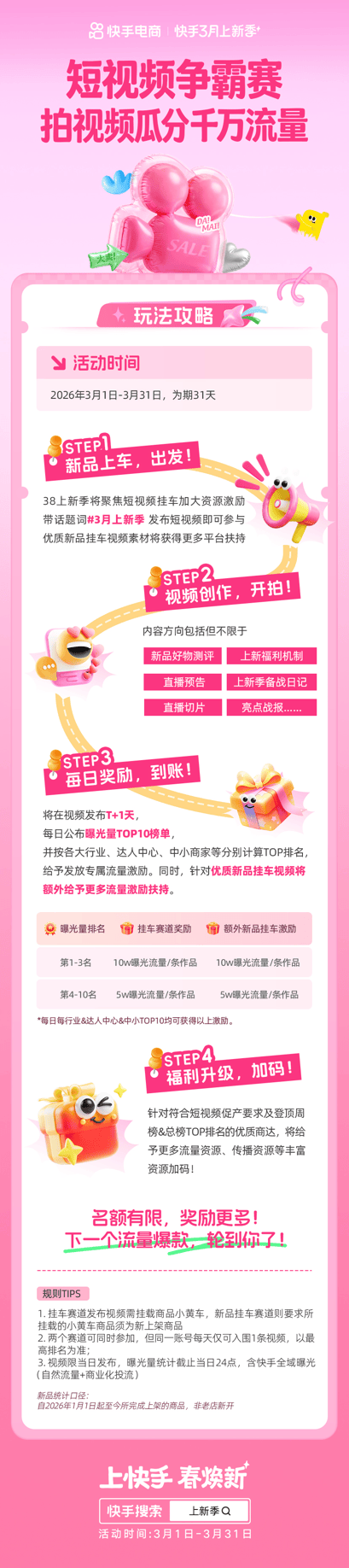 今年的快手3月上新季还将重点加大挂车赛道的资源激励,商达发布新品短视频带话题词#3月上新季 即可参与,优质新品挂车视频还将获得更多平台资源扶持。