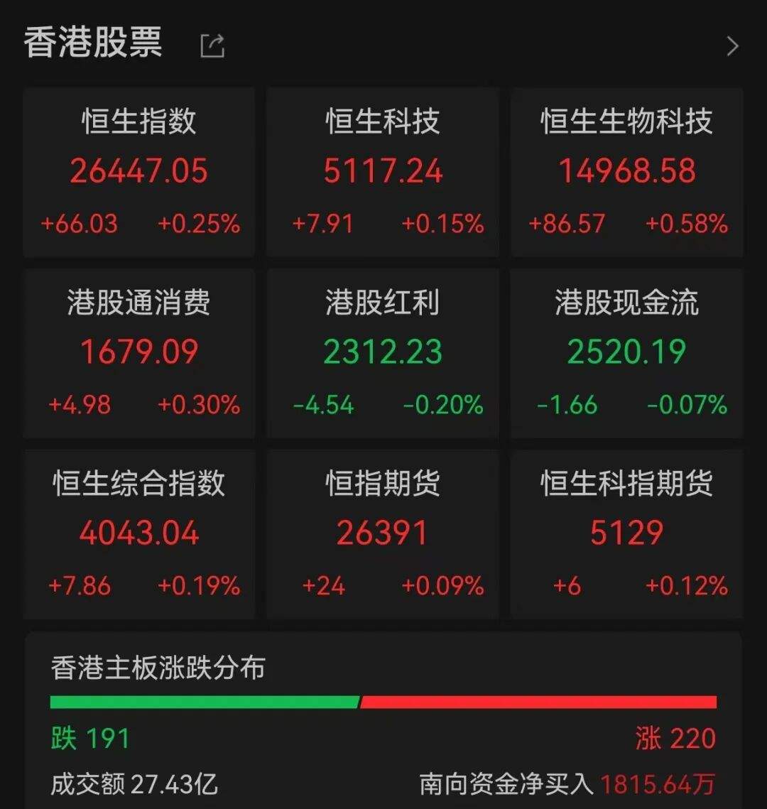 港股高开,香港恒生指数开盘涨0.25%,恒生科技指数涨0.15%。