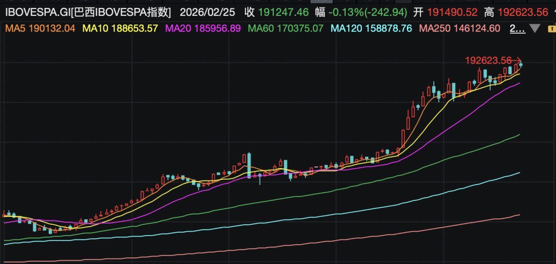 再来看看巴西市场。继2025年大涨33.95%之后,巴西IBOVESPA指数今年继续走强,截至2月25日年内涨幅已达18.69%。