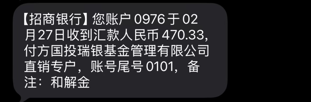 2月27日,李路收到了来自国投瑞银基金管理有限公司的和解金总计470.33元。