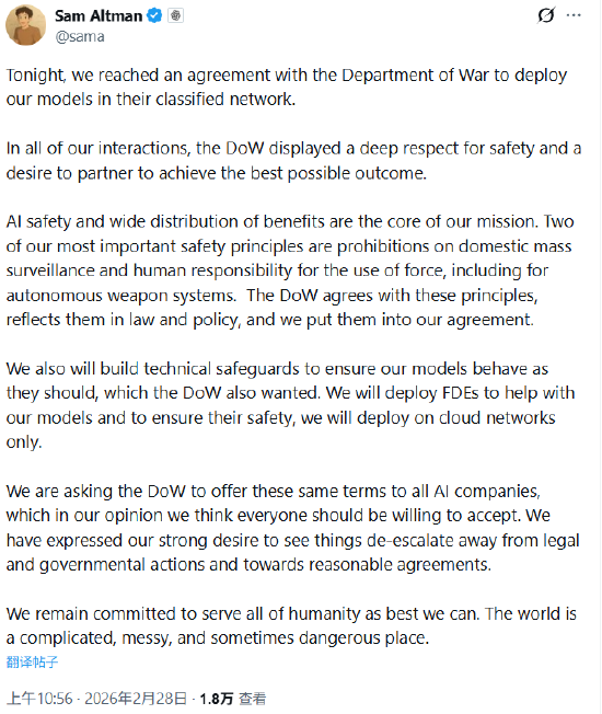 OpenAI奥特曼:与美国国防部达成协议 在机密网络部署其模型