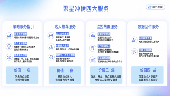 为进一步提升营销效果,磁力聚星为本次IP项目配套推出四大全链路冲榜服务,覆盖热点营销全流程。