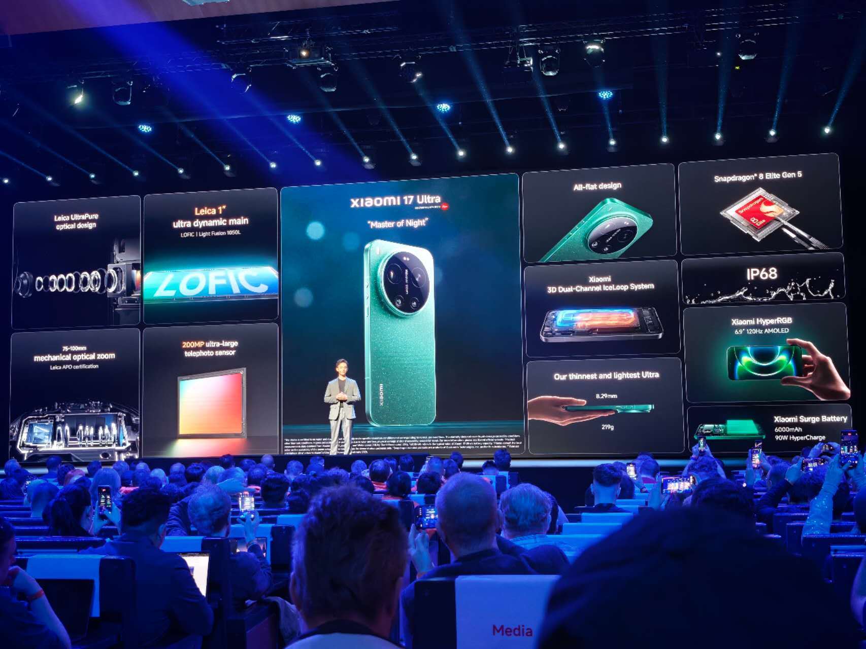 小米17 Ultra也在本次发布会上正式推出,整体配置同样与国内版相同,搭载骁龙8Elite Gen5处理器,配备6.9寸显示屏,峰值亮度可达3500尼特,机身厚度为8.9毫米,重量219克,支持IP68防尘防水。亮点配置在于搭载徕卡三摄系统,搭载1英寸主摄,支持Lofic技术,拥有更大的动态范围,长焦镜头升级为支持75毫米至100毫米光学变焦的2亿像素镜头。海外版小米17Ultra电池容量为6000毫安时。该机16GB+512GB版本,在欧洲市场的售价为1499欧元,折合人民币约12150元。