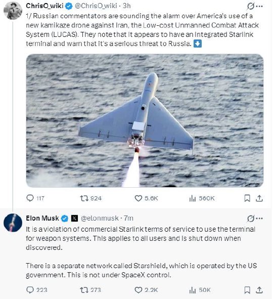 一位网友在X上发帖称:“俄罗斯评论员对美国使用新型自杀式无人机——低成本无人作战攻击系统(LUCAS)攻击伊朗——发出警告。他们指出,该系统似乎集成了星链终端,并警告称这对俄罗斯构成严重威胁。”