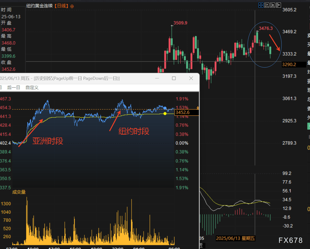 (纽约金2025年6月13日日线图叠加分时图)具体情况是2025年6月13日,以色列空军发动了代号为“崛起的雄狮”(亦有报道称“狮子的力量”)的大规模突袭行动,行动中,以军出动了大量战机,对伊朗境内的核设施、军事目标及高级别军事指挥官和核科学家进行了精准打击。导火索即此次袭击的直接背景是,在行动前一天(6月12日),国际原子能机构理事会通过投票,判定伊朗违反了《不扩散核武器条约》义务,同时,持续了两个月的美伊核谈判陷入僵局,未能达成协议,以色列总理内塔尼亚胡此前已警告,若谈判失败将采取军事行动。之后冲突的经过与升级是从伊朗的报复开始:以色列的空袭立即招致伊朗的强烈反击,伊朗随即展开了代号为“真实诺言-3”的报复行动,向以色列发射了数百枚导弹。之后美国的介入与冲突扩大:2025年6月21日,美国实施“午夜之锤”行动,空袭了伊朗核设施,导致冲突由双边对抗升级为以色列、伊朗、美国的三方对抗,作为回应,伊朗于6月23日对美国驻卡塔尔的乌代德空军基地发动了导弹反击。停火与伤亡:经过12天的激烈交火,双方于2025年6月24日达成停火协议,据统计,冲突导致伊朗方面约935人死亡、近5000人受伤;以色列方面28人死亡、3238人受伤。