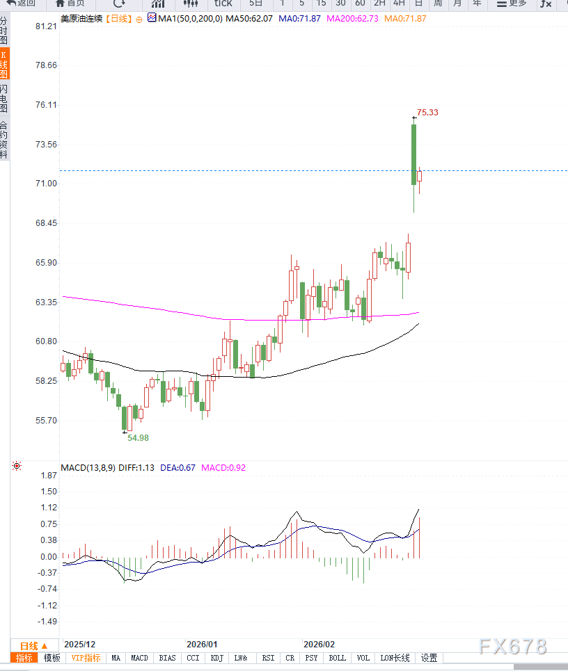 从各大投行观点来看,花旗:短期锚定85美元,尾部风险上看120美元花旗集团将短期布伦特预测上调至85美元/桶,并预计在运输受扰背景下,油价可能维持在80-90美元区间运行。更激进情景下,若区域油气基础设施遭受直接打击,布伦特存在冲击120美元的可能性,相关概率被评估为20%。这一推演强调的并非单纯供需缺口,而是“运输可达性”问题。汇丰:闲置产能无法替代运输通道汇丰银行指出,OPEC+约460万桶/日闲置产能的实际作用取决于运输条件。每日约1900万至2000万桶油当量需经由霍尔木兹海峡出口,占全球供应近五分之一。若海峡断航,替代通道能力不足以完全覆盖原有体量,闲置产能可能成为“纸面数字”。这使油价风险呈现明显上行倾斜。物理约束:封锁超过25天或触发被动减产,摩根大通测算显示,海湾产油国陆上与海上储存能力合计最多支撑约25天正常生产。一旦封锁持续更久,储存设施饱和将迫使产油国减产甚至停产。这意味着风险不再只是价格波动,而是供应链的物理中断。风险溢价已部分计入高盛集团认为,当前约18美元/桶的风险溢价,相当于定价六周断航。即便动用备用管道与战略储备,价格冲击仍难完全对冲。油市交易框架已从库存周期转向通道安全周期。从技术面来看,WTI原油走势更具代表性。日线结构WTI日线已完成对前期整理平台的向上突破,价格重新站稳71美元上方。均线系统开始转为多头排列,5日、10日均线向上发散,显示短期趋势扭转。MACD指标在零轴附近形成金叉,红柱逐步放大,动能改善明显。若价格稳固在71美元上方,将打开进一步上探75美元区间的空间。下方第一支撑:71美元。关键阻力位:75美元心理关口。4小时级别4小时图显示,WTI在急涨后进入高位震荡整理阶段。布林带开口扩大,价格围绕上轨运行,短期多头动能仍在。若回踩不破70美元,属于强势整理结构;若跌破该位置,则可能回补跳空缺口至68美元附近。整体来看,趋势偏多,但波动率显著放大。