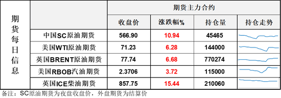 【1】WTI主力原油期货收涨4.21美元,涨幅6.28%,报71.23美元/桶;布伦特主力原油期货收涨4.87美元,涨幅6.68%,报77.74美元/桶;INE原油期货收涨10.94%,报566.9元。