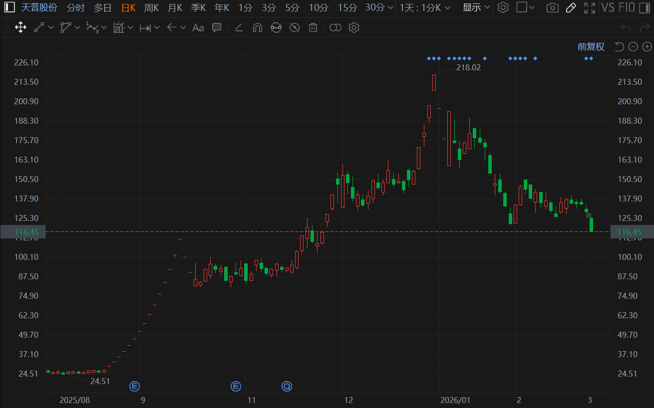 天普股份(605255.SH)封跌停板,报116.45元刷新调整新低,总市值156亿元。消息上,天普股份昨日盘后公告称,公司股价自2025年8月22日至2026年3月2日累计上涨385.70%,已严重偏离上市公司基本面,未来可能有快速下跌风险。公司股票交易多次触及异常波动,已发布30次风险提示公告。截至目前公司及天普欣才均没有人工智能相关的技术或研发人员储备,并无开展人工智能相关业务的计划。