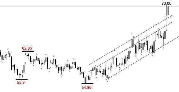 54.86美元至今的上涨浪段,运行在图中所示的上涨通道内部。由于昨日涨幅过大,最新市价已经突破通道线上轨。由于多头过于强势,在下一个顶分形出现之前不建议抱过看空观点。