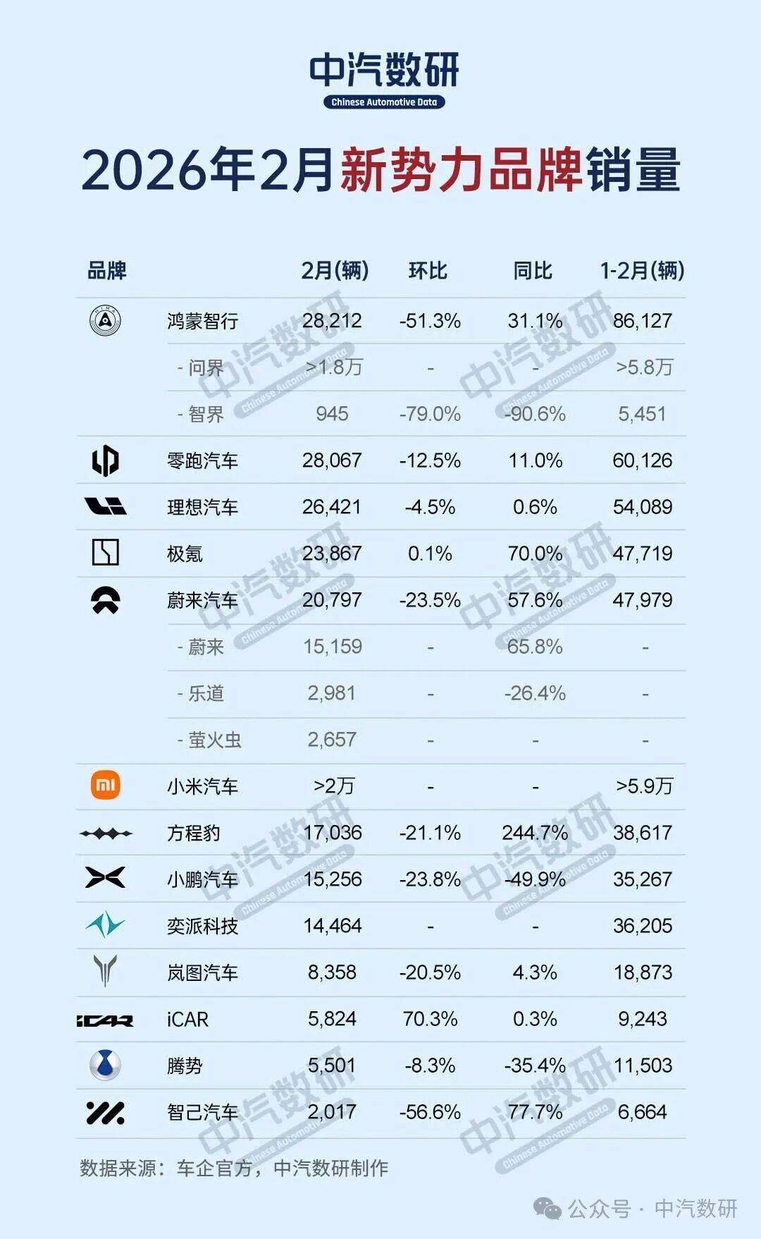 3月初,多数车企陆续公布2月销量数据,受春节长假与购车政策调整双重因素影响,2026年2月国内汽车市场整体呈现回调态势。多数品牌销量出现同比、环比双下滑,但以零跑、蔚来为代表的部分新势力品牌逆势上扬,交出亮眼成绩单。与此同时,自主品牌龙头比亚迪(002594.SZ)、吉利汽车(00175.HK)等在海外市场表现强势,新能源出口与海外布局成为新增长引擎。