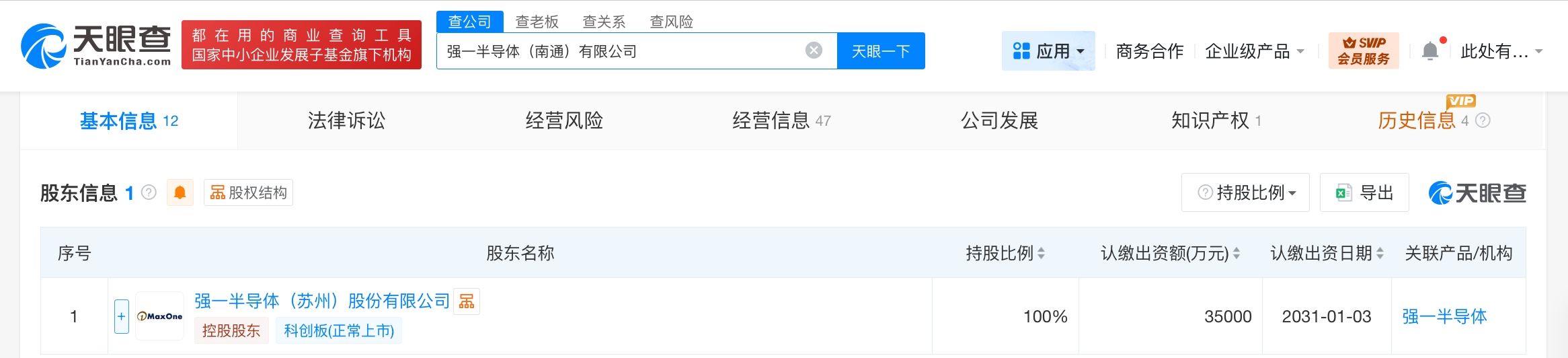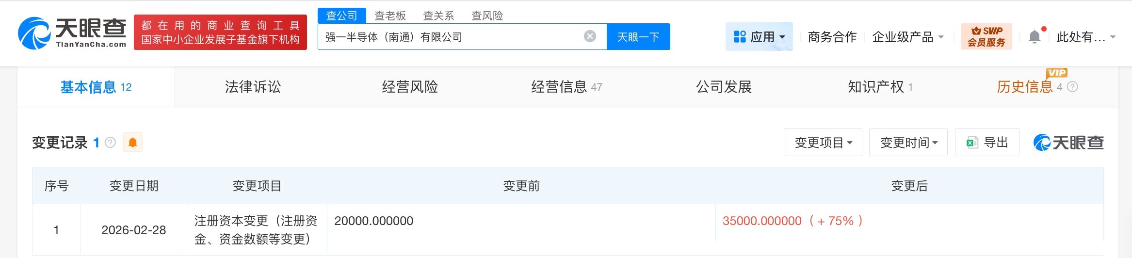 天眼查工商信息显示,近日,强一半导体(南通)有限公司发生工商变更,注册资本由2亿人民币增至3.5亿人民币,增幅75%。