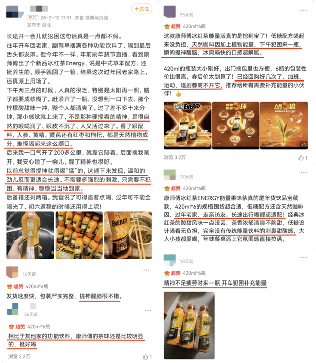 数据显示,截至2月22日,全社会跨区域人员流动量累计完成54.6亿人次,高速公路上每天平均有超4000万辆次往来奔走。肩扛手提或者久坐驾驶,都容易触发“疲劳”关键词,这个时候,一瓶康师傅冰红茶Energy简直是续命神器,有消费者在社交平台感慨“长途开一会儿就犯困,一口下去整个人都清爽了,开了200多公里就靠它陪着”,还有“课代表”直接总结“过年宅家、走亲访友、长途出行喝都超适配”。各大平台正面评价如潮,“困、累、乏”这一高度集中的场景,如今被康师傅冰红茶Energy撞开一道裂缝。