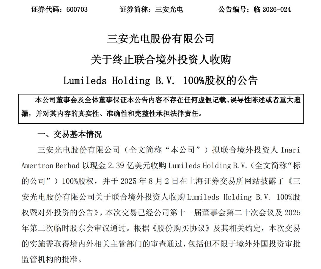 三安光电收购Lumileds案因CFIUS审查未通过而终止