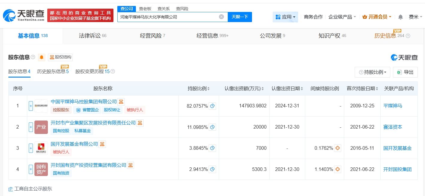 天眼查App显示,近日,河南平煤神马东大化学有限公司发生工商变更,付汉卿卸任法定代表人,由陈国君接任,同时注册资本由约12亿人民币增至约18亿人民币,增幅约50%。