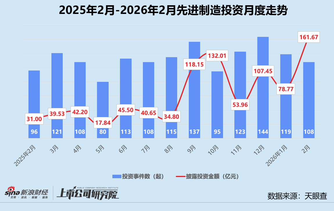 从行业分布来看,先进制造以微弱优势重回第一,本月共有108起股权投资事件,获投企业中约59.3%为集成电路公司,而2025年2月、2026年1月该指标分别为57.3%、52.9%;披露投资额合计161.67亿元,集成电路领域投资总额约占54.7%。商业航天领域展现出惊人的“吸金”能力,23家企业共获64.67亿元投资额,平均单笔投资额约为2.81亿元,同比、环比分别增长727.0%、304.9%。