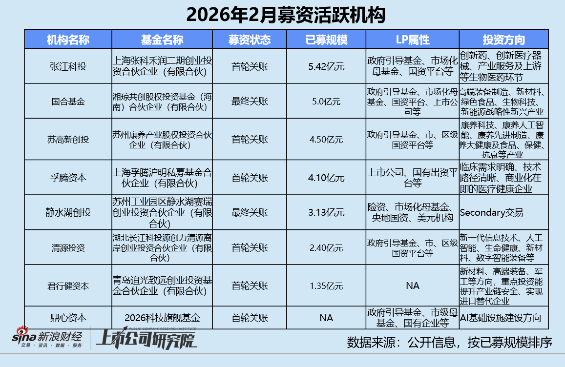 本月募资最活跃的机构包括张江科投、国合基金、苏高新创投等。