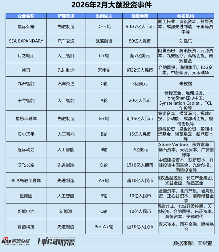 从阶段分布来看,早期阶段的种子轮、天使轮和Pre-A轮投资事件共有185起,约占事件总数的33.6%,明显高于2025年2月的28.8%,但较2026年1月下降近7个百分点。A轮投资事件数稳居榜首,约占投资事件总数三分之一,该指标环比增长5.6%,同比减少3.9%。大量人工智能、商业航天、量子计算等前沿科技初创企业涌入市场寻求融资,早期投资占比持续攀升。