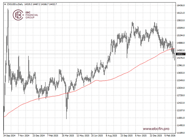 A50指数跟随全球市场下行,200日均线转为阻力位。由于跌破去年10月低位14263支撑,指数可能进一步回落至14100。