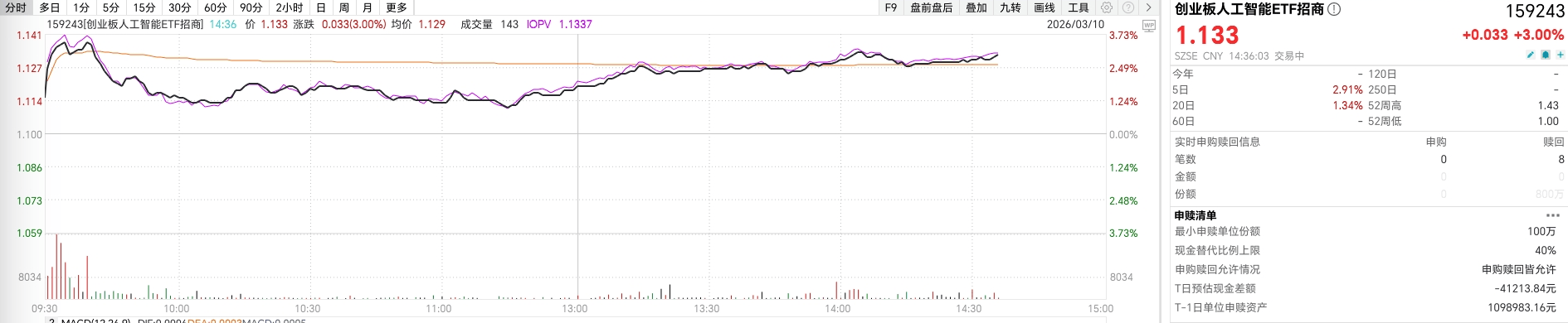 3月10日午后,创业板人工智能ETF招商(159243)上涨3.00%,成份股涨跌互现,天孚通信涨超11%,太辰光、光库科技、锐捷网络上涨超8%,长芯博创、致尚科技等领涨。