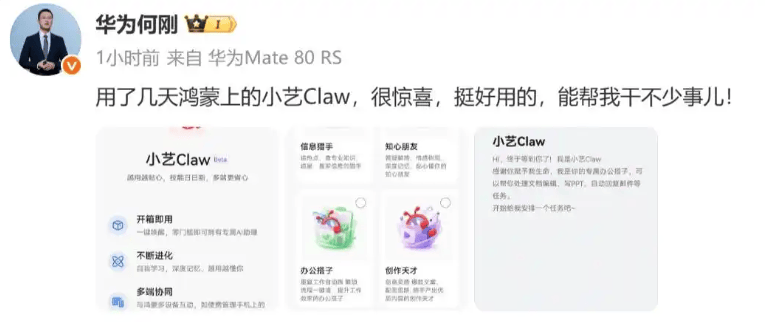 今日,华为终端BG首席执行官何刚亲自晒出小艺Claw Beta界面,体验数日后直言 “很惊喜,挺好用的”,宣告鸿蒙用户正式迎来专属的 “养龙虾” 时代,这款基于OpenClaw模式的AI助理,凭借零门槛、强适配、多能力的特点,成为鸿蒙用户的全新生产力利器。
