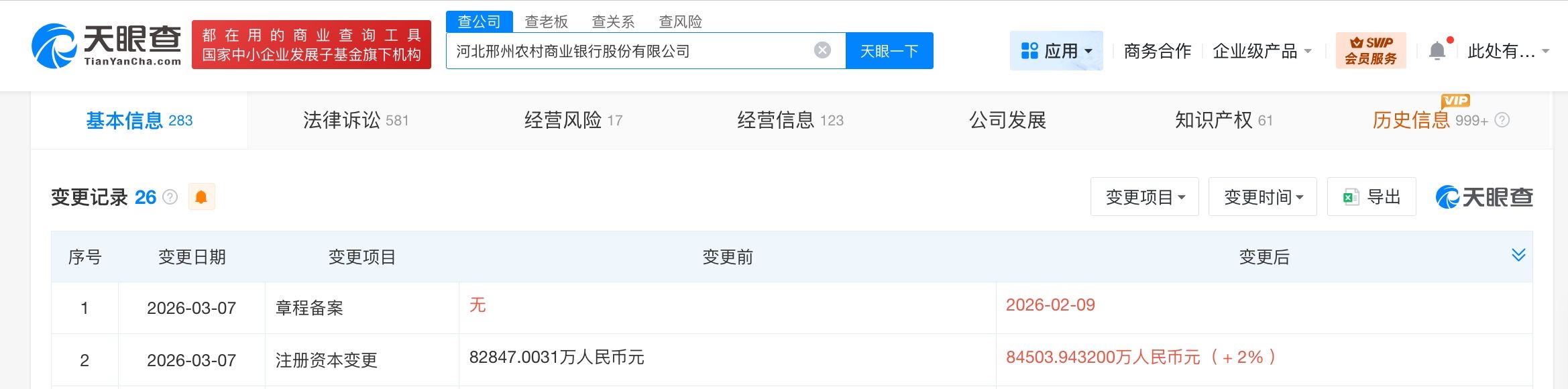 天眼查工商信息显示,近日,河北邢州农村商业银行股份有限公司发生工商变更,注册资本由约8.28亿人民币增至约8.45亿人民币。