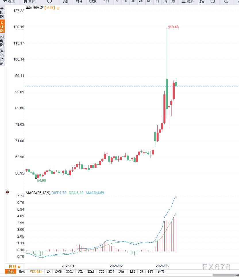 据市场调查显示,能源分析机构认为当前局势可能正在引发全球原油市场史上规模最大的供应冲击之一。市场担忧的核心在于霍尔木兹海峡这一全球最重要的能源运输通道。该海峡连接波斯湾与阿曼湾,是中东原油出口进入国际市场的主要航道,承担全球海运原油贸易的重要运输功能。行业数据显示,霍尔木兹海峡承担全球约20%的海运原油运输量,一旦航运受阻,全球能源供应链将迅速受到冲击。近期局势变化进一步强化了市场对供应风险的预期。伊朗方面的新任最高领导人在公开声明中表示,关闭霍尔木兹海峡将被视为施压对手的重要工具,并警告地区军事设施可能成为目标。这一表态迅速加剧了市场对航道长期受阻的担忧,能源交易商纷纷增加风险溢价,使原油价格快速攀升。与此同时,全球主要能源消费国也开始采取措施以缓解潜在的供应冲击。国际能源机构表示,为减轻冲突对全球经济的影响,成员国可能协调释放约4亿桶战略石油储备。这一规模被认为可能成为历史上最大规模的战略储备释放行动之一。通过向市场增加临时供应,该举措旨在缓冲能源价格的剧烈上涨并稳定市场预期。尽管战略储备释放可能在短期内为市场提供一定缓冲,但能源交易商普遍认为该措施难以完全抵消运输中断带来的冲击。一方面,储备释放属于阶段性措施,其对供应的影响通常具有时间限制;另一方面,如果航道运输风险持续存在,全球市场仍可能面临结构性供应紧张。从市场情绪来看,能源、航运以及大宗商品市场均已明显反映出避险情绪升温。能源交易商开始重新评估全球供应安全,同时基金和机构投资者也在加大对能源资产的配置力度。与此同时,高油价对全球通胀预期也产生潜在影响,这可能进一步影响各国央行的货币政策路径。从技术走势观察,日线图显示WTI原油价格在过去数周形成明显的单边上涨结构,价格已经突破此前重要阻力区域90美元并快速上行,目前短期趋势仍维持强势。动能指标显示多头力量仍占主导,短期关键支撑区域位于92美元附近,如果该区域保持稳固,油价可能继续测试98美元至100美元的重要心理关口。