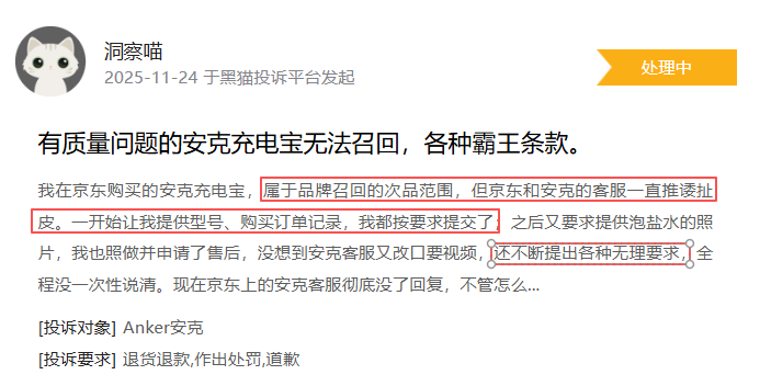安克登黑猫投诉2025年数码产品榜黑榜:安克充电宝电量虚标
