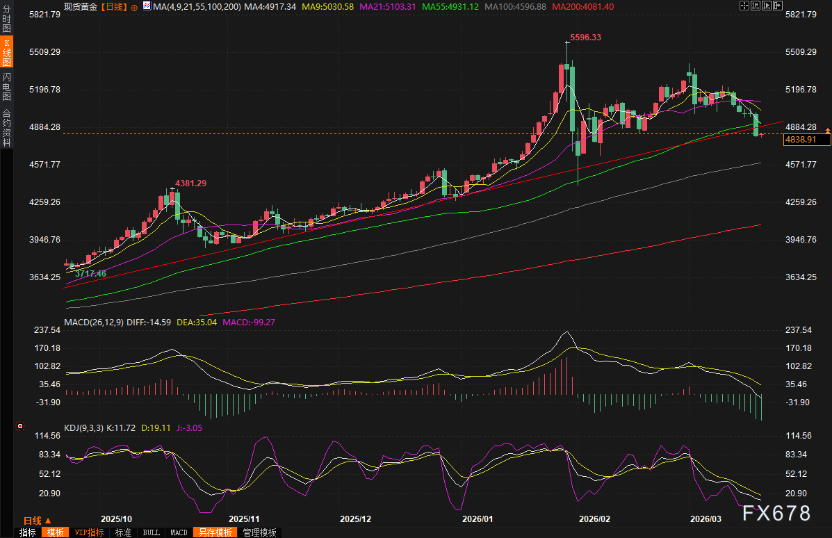 汇通财经APP讯――周三(3月18日)现货黄金经历了剧烈震荡,一度逼近4800美元关口,收盘报每盎司4818.83美元,下跌3.73%,盘中创下超过一个月来的最低水平4807美元/盎司。一方面,中东地缘冲突急剧升级,尤其是伊朗帕尔斯巨型气田遭袭引发连锁报复,布伦特原油维持在110美元以上高位,加剧通胀担忧,打压美联储降息预期;另一方面,美联储最新决策维持利率在3.50%-3.75%不变,并释放出通胀顽固、降息路径谨慎的信号,提振美元指数大涨,共同对金价形成打压。周四(3月19日)亚市早盘,现货黄金低位徘徊,目前交投于4838.75美元/盎司。