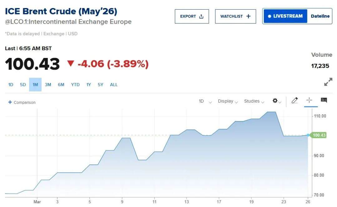 布油价格自2月底以来累计涨幅超过30%,一度冲高至114美元/桶附近,目前维持在100美元/桶左右;天然气方面,欧洲TTF基准近期一度暴涨35%,亚洲JKM现货也创三年新高。