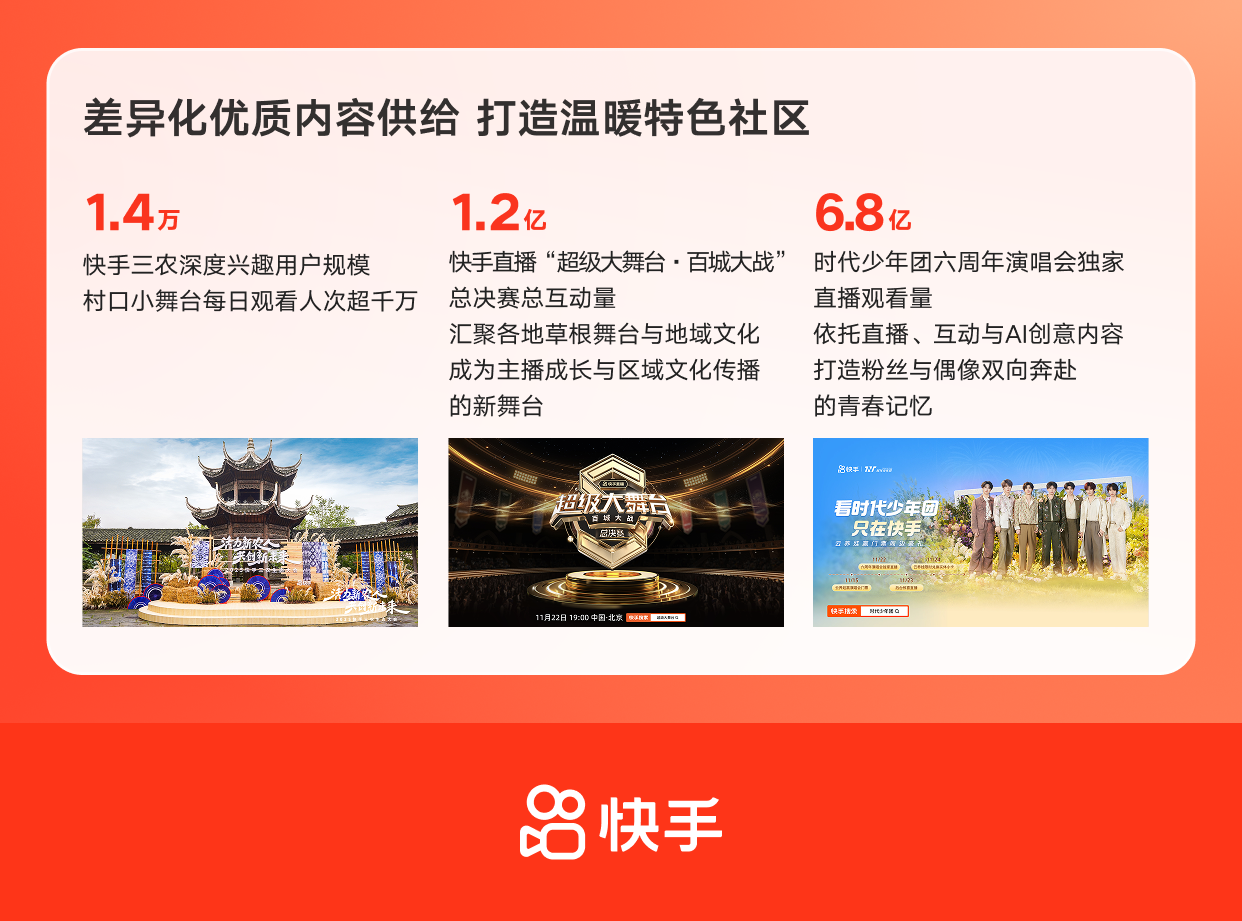 互动生态方面,私信互动玩法持续创新,推动日均双关私信渗透率同比提升近3%。内容供给方面,平台持续打造具有快手特色的差异化内容生态,真实内容、特色垂类与区域文化内容保持活跃,进一步强化社区温度与平台辨识度。