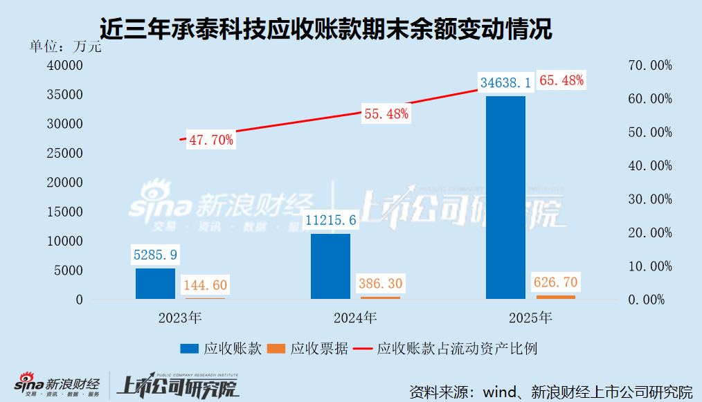 据招股书披露,2023年至2025年,承泰科技应收账款期末余额分别为5285.90万元、1.12亿元、3.46亿元,分别占流动资产的47.70%、55.48%、65.48%,呈逐年上升趋势。其中,比亚迪的应收账款分别为4640万元、1.07亿元、3.42亿元,占比持续提升。