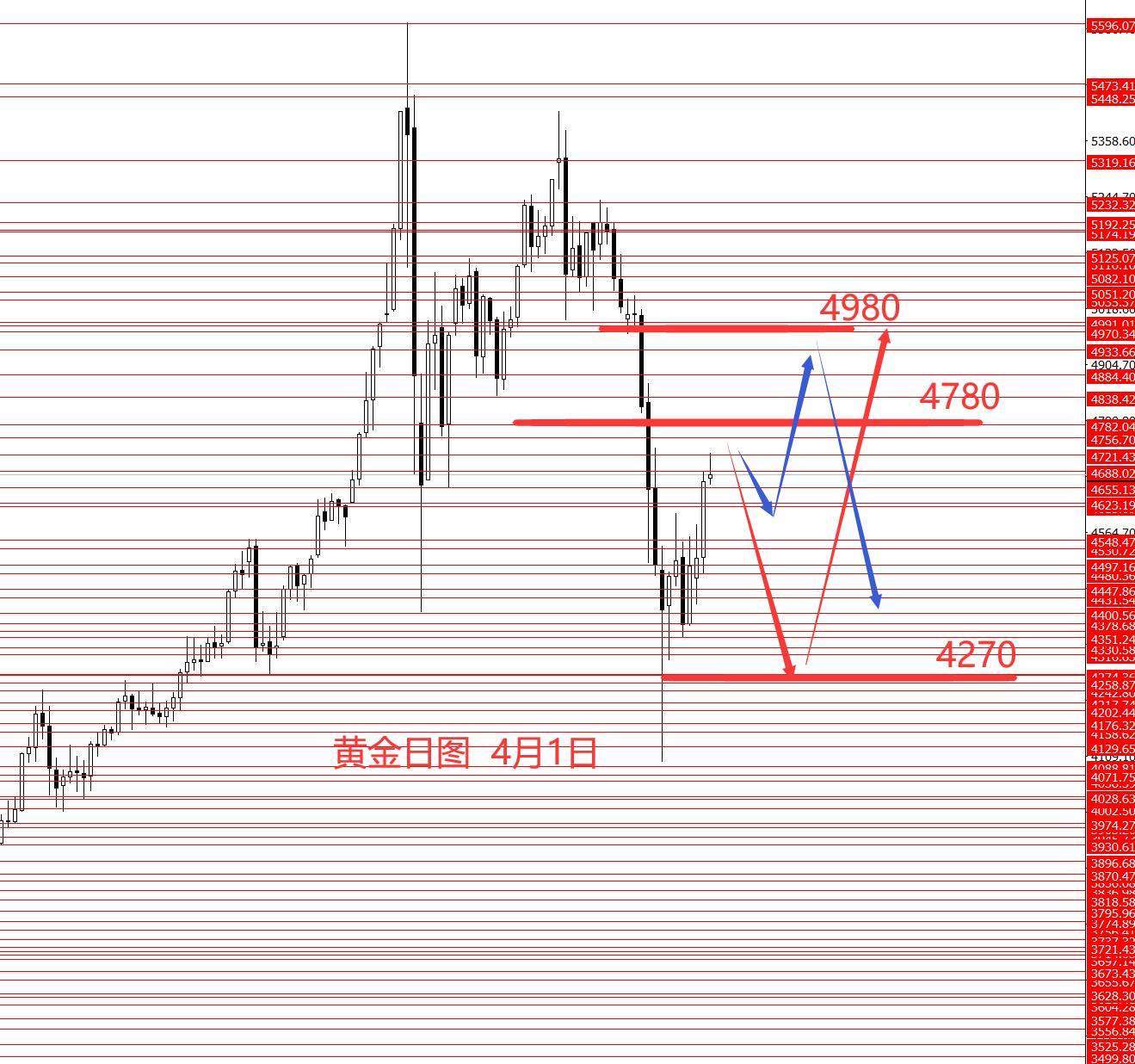 黄金三月也正如预期从5370跌至4780,最低4100附近,黄金中线波段思路正确。从图形来看,黄金四月区间震荡的概率相对较大些,区间先关注5000至4270,本月二次下探4270的概率相对较大些,只是不确定是先测试了5000再跌,还是连4780都上不去先下探4270再向上测试5000区域。今日没有具体操作建议,只有一个大概框架,重点关注周五非农数据,下周一行情明朗些会再更新文字稿件,大家敬请期待。