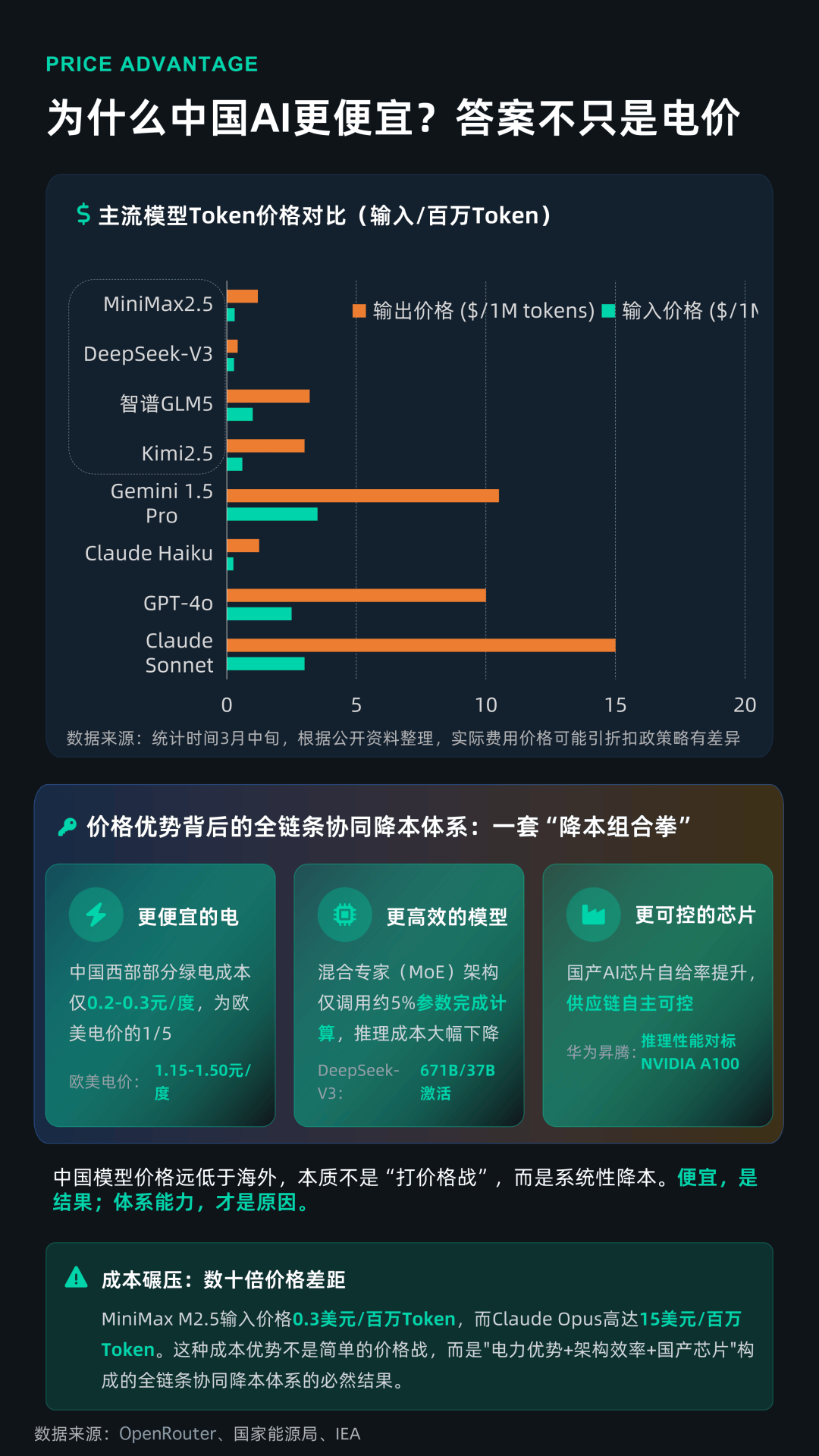 从产业链拆解来看,Token出海是一条典型的价值放大链条。最上游是能源层,中国西部绿电成本约为0.2-0.3元/度,仅为欧美的约1/5,构成全球竞争中低成本的“原材料”护城河;中游是算力层,通过数据中心(AIDC)将电力转化为计算能力,液冷等技术将PUE降至1.25以下,大幅提升能效;再往上是模型层,以DeepSeek为代表的混合专家(MoE)架构,仅激活约5%参数即可完成推理,理论上将成本降低至GPT-4的1/30以上;最终在应用层,AI Agent(智能体)的兴起,使Token需求呈指数级增长,一个复杂任务的Token消耗可达普通对话的数千甚至上万倍。
