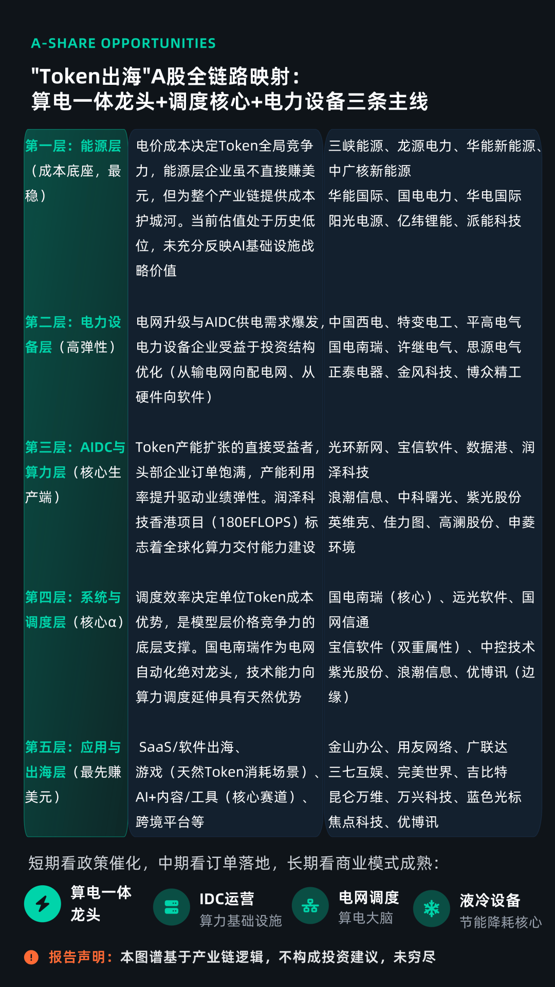 放大到国内上市企业图谱上看,Token出海并非单一公司机会,而是贯穿“算电协同”全产业链的系统性机会。短期看,算电协同龙头企业、IDC运营、液冷设备、电力设备等“卖铲人”环节有望率先受益;中期看,算力调度与模型优化能力成为核心;长期看,真正实现价值兑现的,将是掌握应用场景与全球客户资源的模型和应用厂商。