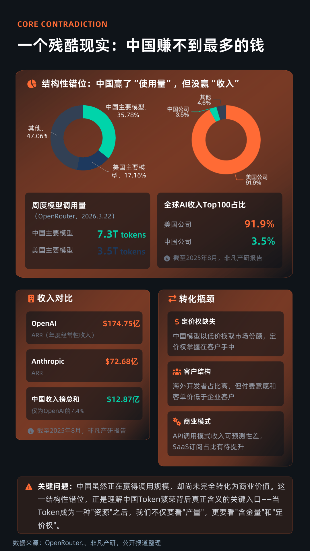 不过,报告也强调,当前中国在Token出海中仍面临“规模领先但价值不足”的结构性矛盾。研究机构数据显示,中国公司在全球AI模型调用量中占比已接近一半,但在全球AI收入中占比相对偏低。这反映出,中国虽有“使用量”,但尚未掌握“定价权”。