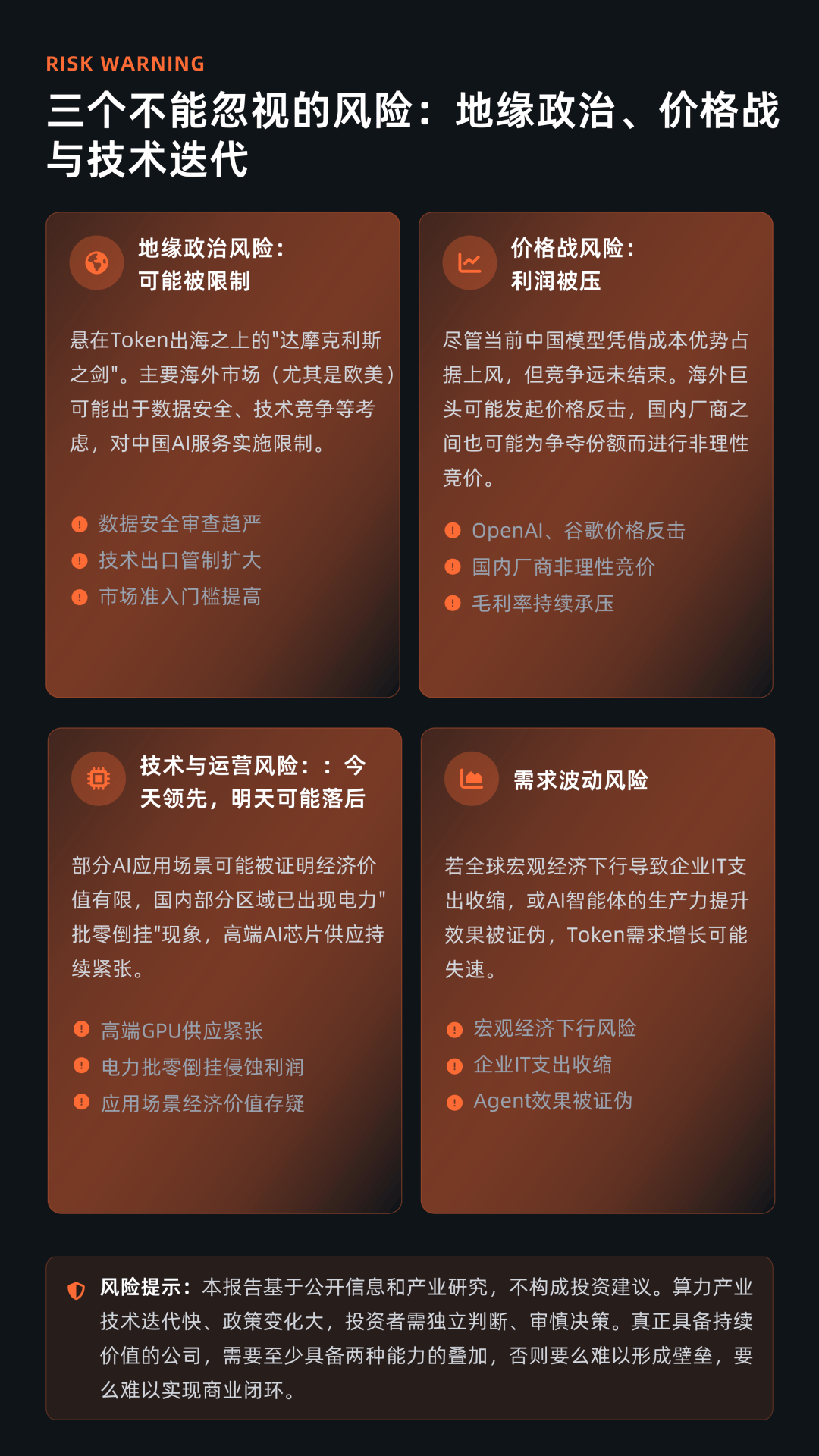 这一差距背后,既有商业模式尚不成熟(API收入波动大、SaaS占比低),也有客户结构问题(开发者多、企业客户少),更受到地缘政治、技术封锁及潜在价格战的多重影响。尤其是在欧美市场,数据安全与技术竞争可能成为限制中国AI服务扩张、Token出海的重要变量。