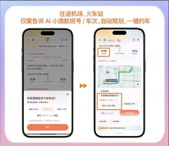 比如告诉小滴“我明天要乘高铁G21,帮我约一辆车”,小滴就会自动查询高铁出发时间和高铁站,根据用户希望提前抵达车站的时间、结合路况来推算叫车出发时间,自动为用户寻找后备箱大的车型,航班同样适用。