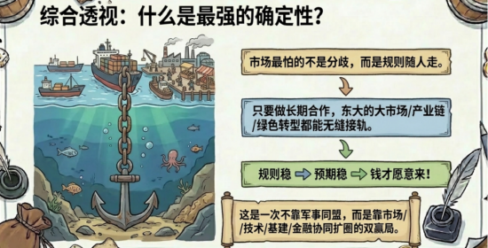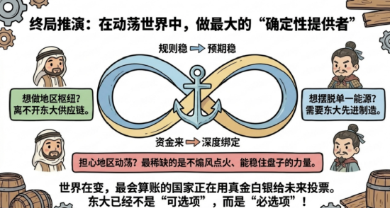 阿联酋很清楚,美国已经渐渐靠不住了。美国当然还是重要力量,但当地区风险、航运风险、金融风险一起冒头时,阿联酋必须把东大这个全球最大制造中心、重要能源买家、稳定投资来源和国际斡旋力量,更深地拉进自己的国家战略框架里!
