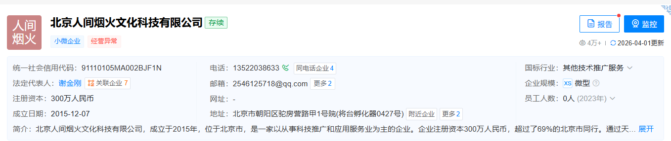 《活色生香》由珠江电影集团有限公司与北京人间烟火文化科技有限公司联合出品。天眼查显示,北京人间烟火文化科技有限公司因未依照《企业信息公示暂行条例》第八条规定的期限公示年度报告,于去年10月被北京市朝阳区市场监督管理局列入经营异常名录。