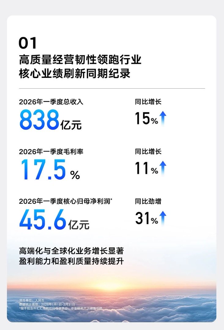 盈利层面,总营收838亿元、同比增长31%,核心归母净利润45.6亿元,同比劲增31%,核心利润增速高于收入增速,高端化与全球化红利集中释放;毛利率17.5%,同比增长1.8个百分点,核心归母净利率5.4%,同比增长0.6个百分点,盈利质量领跑行业。