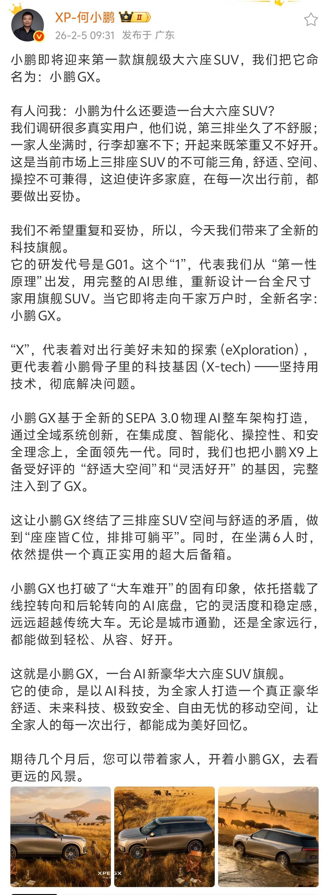 何小鹏官宣首款大六座SUV小鹏GX:基于SEPA 3.0物理AI整车架构打造