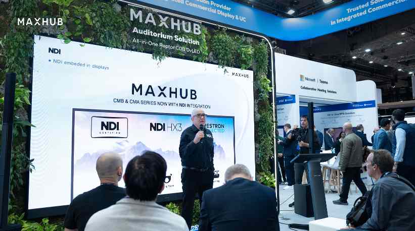 在商业显示端,全球首款通过NDI?认证的智能显示屏――MAXHUB Digital Signage CMB系列引发参展观众关注。该系列产品具备智能感知功能,可在Microsoft Teams会议启动时自动亮屏,会议结束后自动休眠,实现能效管理智能化。