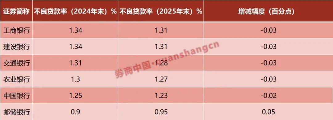 其中,国有大行发挥“定海神针”作用,六大行中有五家实现不良贷款率压降:工商银行、建设银行均从1.34%降至1.31%;农业银行从1.30%降至1.27%;交通银行从1.31%降至1.28%,不良率较上年末均下降3个基点;邮储银行不良率虽较上年末微增至0.95%,但在六大行中仍保持领先水平。