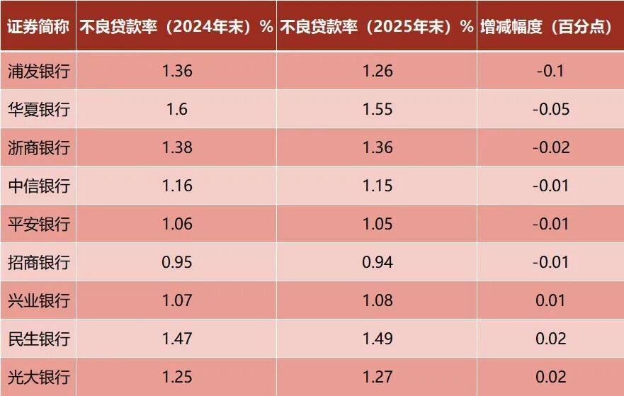 在股份行阵营中,浦发银行的资产质量保卫战战果颇丰,其不良贷款率从2024年末的1.36%大幅下降10个基点至1.26%,是该行近11年来的最低水平,招商银行(0.95%降至0.94%)、平安银行(1.06%降至1.05%)和中信银行(1.16%降至1.15%)等不良率则继续在低位平稳向好。