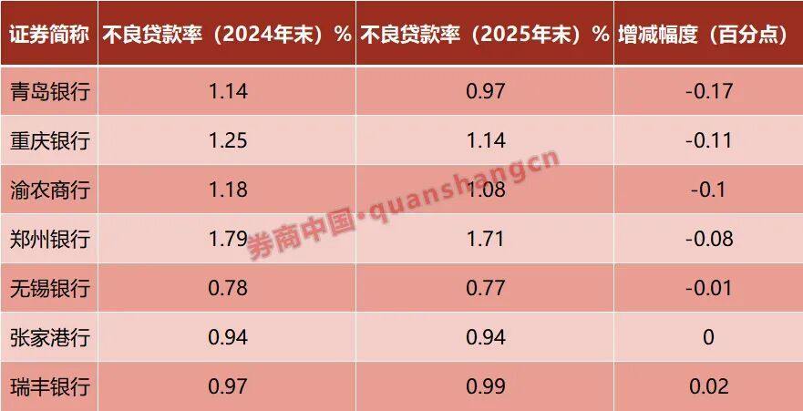 其中,青岛银行表现最为亮眼,其不良率从2024年的1.14%大幅压降17个基点至2025年的0.97%,成功迈入“不良率低于1%”的优等生阵营;西南地区两家银行资产处置同样成效显著,重庆银行不良率由1.25%降至1.14%,下降11个基点;渝农商行由1.18%降至1.08%,降幅10个基点。