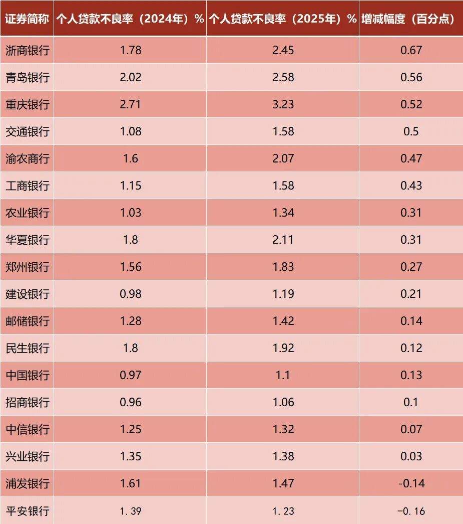 几家国有大行个贷不良指标较上年末出现上升。其中,工行由1.15%调整至1.58%;交行由2024年的1.08%变动至1.58%;农行(1.03%至1.34%)与建行(0.98%至1.19%)的个贷不良率也伴随市场环境变化,出现20甚至超过30个基点的波动。
