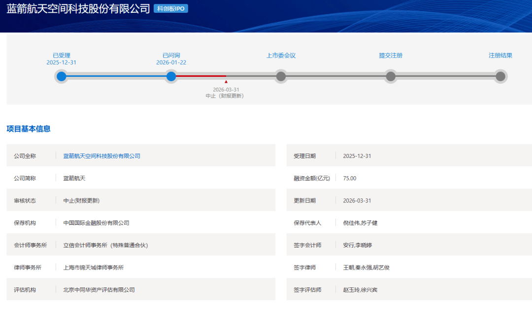 2026年3月31日,上交所官网一则“中止”公告,让蓝箭航天这只被寄予“商业航天第一股”厚望的标的,突然按下IPO进程暂停键。这场拟募资75亿元的资本冲刺,不仅因财务资料过期触发常规流程调整,更因保荐团队的突发人事变动、行业监管新规落地,以及保代间的争议纠纷,成为2026年A股科创板最受关注的事件之一。