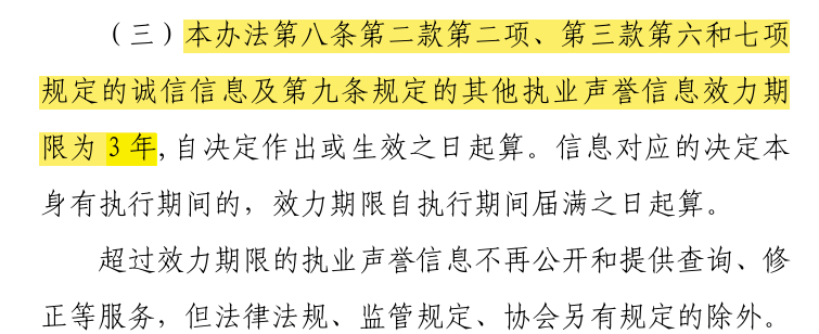 二是统一声誉信息效力期限为3年。 超过期限的信息不再公开查询,仅保留基本信息。这一规则有助于平衡历史信息的长期留存与从业人员的职业发展空间。