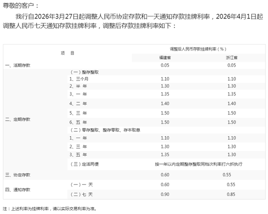 与此同时,厦门银行还调整了部分零售存款产品的挂牌利率。3月31日,该行发布公告称,自4月1日起,一天通知存款由0.65%降至0.60%;七天通知存款由0.95%降至0.90%,均分别下调5个基点。